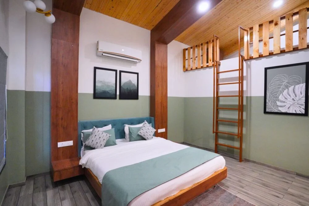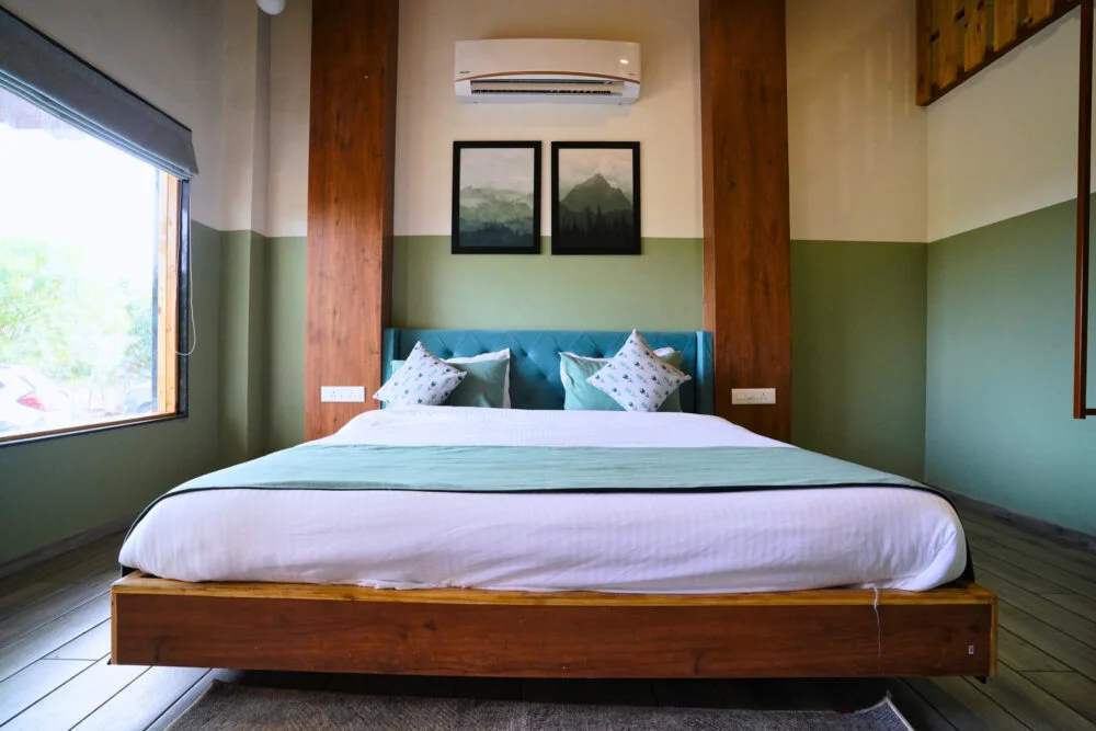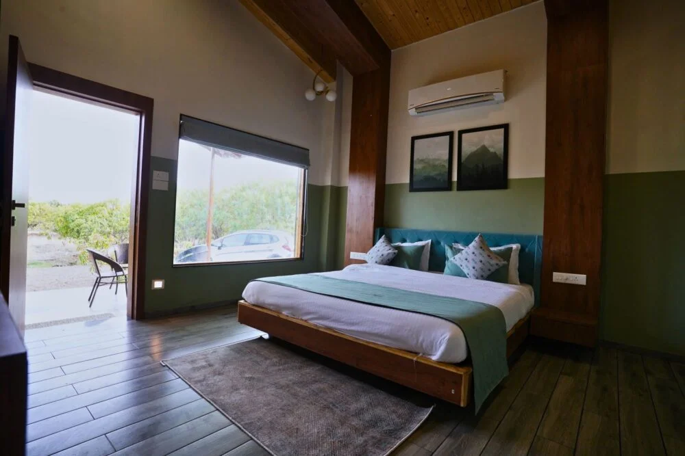 Step into a world of contemporary elegance with our Aqua and Olive-themed cottages, designed to indulge both the young and the young-at-heart. Featuring stylish bunking spaces, these cottages create the perfect setting for family fun, coupled with the utmost comfort provided by air conditioning. Beyond the sleek interiors, enjoy a breath of fresh air with views that overlook a refreshing mango orchard. A picture-perfect amalgamation of modern aesthetics and natural beauty.